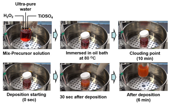 CBD is a simple, inexpensive, convenient, and scalable technique to pattern TiOx CLs from aqueous solutions, making it advantageous for large-scale production of thin films for organic photovoltaic cells and PSCs [58]. Several reports have been published about CBD TiO2-based PSCs. Recently, Liu and co-workers reported PSCs containing co-doped TiO2 ETLs formed by low-temperature CBD with a PCE of 19.10% [59]. In addition, the group led by Takahashi and Kuwabara developed a technique to pattern TiOx films at low temperatures and used them as ETLs in organic photovoltaic cells that exhibited a PCE of 3.8% under AM1.5G simulated sunlight [60]. TiO2 CLs fabricated by CBD form good physical and electronic contacts with perovskite photosensitive layers. We reported PHJ PSCs with TiOx CLs formed by CBD and modified with a thin layer of fullerene or a derivative as ETLs [47,48,61,62]. The scalable CBD technique solely enables production of TiOx CLs at low temperature [63]. Photographs of the hydrolysis steps of CBD are shown in Figure 2. A 30 nm TiOx film is formed in a single operation. The thickness of TiOx can be increased by repeating the operation. However, it is quite difficult to control the morphology and thickness of TiO2 CLs fabricated by CBD, which leads to poor reproducibility. Therefore, it remains important to develop a technique to fabricate high-quality TiO2 CLs for efficient PHJ PSCs that is scalable, controllable, and low cost. This process can be used for roll-to-roll production, which may contribute it a potential candidate for low-cost commercial production of TiO2-based ETLs in future solar modules.
