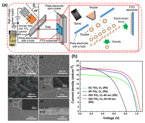 Inkjet printing is a scalable technique that is compatible with roll-to-roll processing. In addition, inkjet printing is cost-effective and has a high material utilization rate, which may lower the production cost of devices. Wei et al. reported efficient PSCs containing TiO2 CLs formed by electrodeposition [53]. Electrodeposition is a simple, cost-effective, and scalable technique to pattern uniform TiO2 CLs. The surface morphology and thickness of TiO2 CLs can be controlled by simply manipulating deposition conditions. In addition, we recently developed an OEI bottom-up strategy to produce TiO2 CLs that involves discharging a spray using electrostatic force. In the OEI strategy, an FTO substrate was patterned with a TiO2 precursor solution using an ejection angle of 45° with respect to the substrate (Figure 3a). The OEI technique produced high-quality TiO2 CLs on FTO substrates, which were used as the ETL in PSCs that showed a PCE of 13.19% [64]. Unlike other bottom-up techniques, OEI deposition offers a simple and cost-effective way to obtain high-quality TiO2 films with easy-to-control thickness. Using OEI deposition, large-area stacked thin films can be fabricated with high reproducibility. The surface morphology of TiO2 films was tuned by simply changing the coating time. Large-scale printing using OEI deposition may be realized by changing the single nozzle system to one with multiple nozzles. OEI deposition can be used to pattern a variety of substrates on a large scale to achieve high-throughput, large-area perovskite solar modules. The scalability, large-area uniformity, and low-cost fabrication capability with a high material utilization rate of OEI deposition might lower the production cost of resultant devices. This simple technique to fabricate TiO2 CLs may help to further improve the photovoltaic performance of planar small- and large-scale PSC modules.