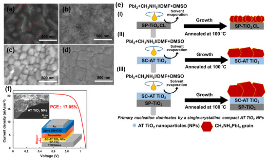 SEM images of the (a) SP-TiO2 layer and (b) SP-TiO2/SC-anatase (AT) TiO2 nanoparticle (NP) bilayer and perovskite films grown on the (c) SP-TiO2 layer and (d) SP-TiO2/SC-AT TiO2 NP bilayer. (e) Schematic of the nucleation and growth of perovskite grains. (f) Reverse J-V curve obtained for a solar cell with the NP bilayer. Insets shows the device structure and an SEM image of the NPs. Reproduced with permission [65]. Copyright 2018 American Chemical Society.