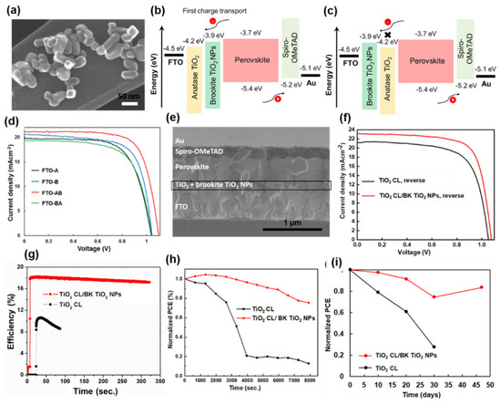(a) Scanning transmission electron microscope (STEM) image of brookite (BK) TiO2 NPs. Schematic illustrations of the energy-level alignment in devices with (b) FTO-anatase-brookite (AB) and (c) FTO-brookite-anatase (BA) as electron transport layers (ETLs). (d) J-V curves of PSCs with FTO-anatase (A), FTO-brookite (B), FTO-AB, and FTO-BA as ETLs. (e) Cross-sectional SEM image of the PSC with an FTO-AB ETL. (f) Reverse J-V curves obtained for the PSCs on substrates with and without a brookite (BK) TiO2 NP layer. (g) Efficiency at maximum power point under continuous one-sun illumination (100 mW/cm2). Reproduced with permission [66]. Copyright 2019 American Chemical Society. (h) Normalized PCE vs. time (in seconds) of TiO2 CL/BK TiO2 NP-based PSCs (non-encapsulated) after continuous exposure to one-sun illumination for 2.12 h in air with 60–70% relative humidity. (i) Normalized PCE versus time (in days) of PSCs (non-encapsulated) stored in the dark under dry N2. The devices were measured under ambient conditions at 60–70% relative humidity. Reproduced with permission [67]. Copyright 2020, Royal Society of Chemistry.