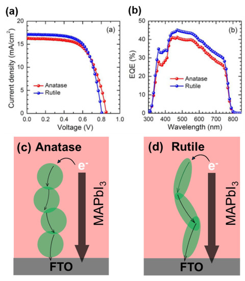 (a) J-V curves and (b) incident photon-to-current efficiency (IPCE) spectra of devices containing anatase and rutile TiO2 thin films. Schematic of electronic behavior of devices with (c) anatase TiO2 and (d) rutile TiO2 films. Reproduced with permission [88]. Copyright 2014, Royal Society of Chemistry.