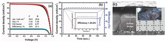 (a) J-V characteristics of the best-performing PSC fabricated on K2 substrates, which showed a PCE of 21.1% and VOC of 1.15 V. (b) Steady-state PCE and Jsc at maximum power point of the best-performing device. Inset is a magnified image of the efficiency (blue dotted line) and Jsc (black dotted line)). (c) Combined cross-sectional SEM image and schematic of a doped TiO2 mesoporous layer and the surface states bonding with the ETL and perovskite. Reproduced with permission [44]. Copyright 2018, Wiley-VCH Verlag GmbH & Co. KGaA, Weinheim.
