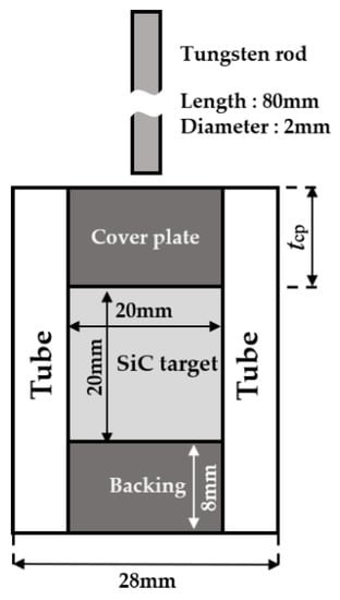 The confined SiC target refers to that used in the experiments carried out by Lundberg et al. [6]. The structural geometries consist of an SiC target, a maraging steel (Mar 350) tube, tempered steel (SIS 2541-3, comparable to AISI/SAE 4340) cover and backing plates. The target structure is impacted by a cylindrical tungsten rod (2 mm in diameter and 80 mm in length) at different velocities. The thickness of the cover plate (denoted by tcp), ranges from 3 mm to 8 mm at an interval of 1 mm. The sketch of an SiC target, tube, cover plate, backing and tungsten rod is shown in Figure 1.
