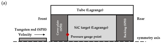 Two-dimensional (2D) axisymmetric models of the SiC target and tungsten rod were developed using AUTODYN®, as shown in Figure 2. Axisymmetric Lagrangian elements with four nodes and one integration point were used to discretize SiC targets and steel tubes. The rod is discretized by the smooth particle hydrodynamics (SPH) method. Regarding the cover plate not fixed to the tube, both the cover and backing plates are modeled by the SPH method. For the cover plate fixed to the tube, the cover and backing plates are composed of two parts, i.e., the outer and inner parts, which are modeled using the Lagrangian method and SPH method, respectively, as shown in Figure 2. These two parts are joined together using the “JOIN module” on their interface. In all cases, the backing plates are joined to the tubes. The SPH particle size in the tungsten rod, the cover and backing plates is 0.125 mm, which is the same as that used by Quan et al. [25]. The Lagrangian element sizes in the SiC target, and the outer part of the cover and backing plates are 0.15 mm and 0.125 mm, respectively. A pressure gauge point is set on the surface of the SiC target with a distance of 2 mm away from the symmetry axis.