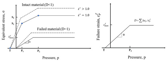 where is the increment in equivalent plastic strain during a cycle of integration, is the equivalent plastic strain at failure under a constant pressure P. Referring to the right portion of Figure 3, the material cannot undergo any plastic strain at the maximum hydrostatic tension T, but it increases to at a compressive pressure of P = P3. P3 and are the damage constants. Then the failure strain is simply defined as