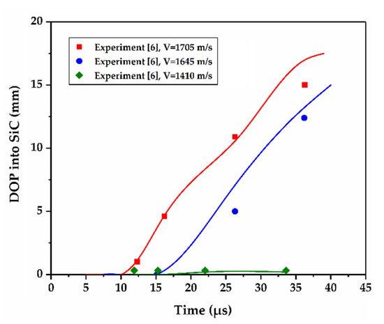 Three experiments presented by Lundberg et al. [6] were simulated, the impact velocities of which are 1410 m/s, 1645 m/s and 1705 m/s, respectively. In the simulations, the interface defeat, dwell–penetration transition, and penetration are observed. Variation of the DOP in SiC targets with time is compared with experimental measurements. As shown in Figure 4, the errors are all within an acceptable range, and are also close to the simulation results of our previous work [28].