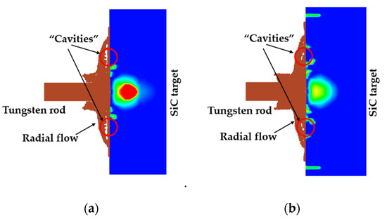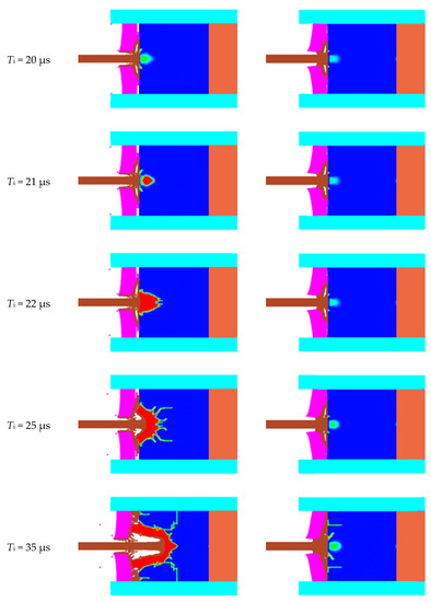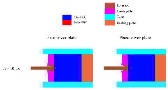 By way of illustrations, the SiC target with both free and fixed cover plates (4 mm in thickness) impacted by the tungsten rod at the velocity of 1250 m/s are analyzed. The impact process at different times (denoted by Ti, which is defined as the time after the tungsten rod starts to move from its initial position) from 10 μs to 35 μs are shown in Figure 5. When Ti = 10 μs, the tungsten rod completely penetrates the cover plate and makes contact with the SiC target, and the initial damage position in the SiC target with the fixed cover plate is deeper than that with free cover plate.
