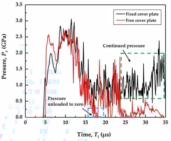 Compared to free-mode, the enhancement of the ballistic performance of the SiC target for the fixed-mode can be attributed to the radial flow caused after the interface dwell. Since the radial flow is constrained by the cover plate, it will keep pressure (denoted by Pc) on the SiC surface. Time histories of pressure at the gauge point 2 mm away from the impact point on the SiC target surface with both fixed and free cover plates are shown in Figure 6. The tungsten rod begins to make contact with the cover plate at 4 μs, the initial pressure peak on the surface of SiC target with the fixed cover plate is 2.00 GPa, lower than that for the free cover plate, i.e., 2.55 GPa. At the impact time of 10 μs, the tungsten rod is in contact with the SiC target, and the surface stress reaches the maximum value. The peak pressure on the SiC target surface with fixed cover plate is slightly higher than that for the free-mode, showing 3.75 GPa and 3.00 GPa, respectively. For the impact time in the range of 10 μs to 20 μs when interface dwell occurs, the cover plate is deformed or even lifted as a result of radial flow, and Pc begins to decrease.