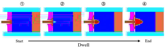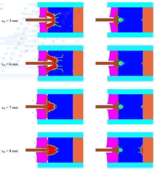 Figure 10 shows the radial flow pattern of the rod fragments for the cover plate thicknesses of 6 mm and 7 mm at the same dwell time, respectively. Cavities are observed in the radial flow, which are larger when Tcp = 6 mm. They disappear more quickly when the cover plate is 7 mm thick. It seems that the thicker cover plate can prevent the cavity from happening. Combined with the analysis of the radial flow effect in the preceding Section 3.1, the disappearance of “cavities” seems to be beneficial to the pressure maintenance of the ceramic surface.