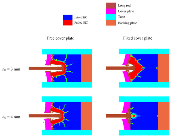 In order to analyze the effect of the cover plate on the ballistic performance, numerical simulation results of tungsten rods impacting the confined SiC targets were performed. Two connection modes between the cover plate and tube, i.e., free- and fixed-modes, were modeled in the numerical model. In addition, numerical results of interface defeat, dwell–penetration transition and penetration for different thickness of cover plates were obtained. The damage process of SiC target, dwell duration, and transition velocities will be discussed as follows.