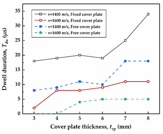 The variation of dwell duration for the cover plates with different connection modes and varying thicknesses are demonstrated in Figure 9. The impact velocities are 1400 m/s and 1600 m/s, respectively, it can be founded that the dwell duration decreases as the impact velocity increases. For the cover plates with the thicknesses of 3 mm and 4 mm, when the impact velocity is 1600 m/s, interface defeat is generated for the fixed-mode, while dwell-penetration transition occurs for the free-mode. As for the cover plates with other thickness, the average dwell duration for the fixed-mode is about two times of that for the free-mode. Obviously, connecting the cover plate to the tube can greatly increase the dwell duration. For both free-and fixed-modes, when the impact velocity is 1400 m/s, dwell duration increases slowly as the cover plate thickness changes from 3 mm to 6 mm, then it grows rapidly as the thickness varies from 6 mm to 8 mm. Similarly, this phenomenon was also observed in experiments when the ratio of the cover plate thickness to the rod diameter was 0.25~1 and the impact velocity was medium [32].