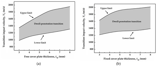 As demonstrated in Figure 11, the upper and lower limits of transition impact velocity can be obtained, respectively, when the cover plates with different thicknesses and connection modes are impacted with high velocity. For the cover plate with the free-mode, the increase rates of both the upper and lower limits are rapid and then slow down with the increase in cover plate thickness, as displayed in Figure 11a. The size of the transition velocity region gradually increases and then remains stable. Regarding the cover plate with the fixed-mode, the upper limit of transition velocity increases rapidly when the thickness of the cover plate gradually changes from 3 mm to 5 mm, then the increase rate slows down, as shown in Figure 11b. The increase rate of the lower limit is relatively stable, and the fastest growth rate occurs when the thickness changes from 3 mm to 4 mm. In addition, the transition velocity region (i.e., the grey area) gradually enlarges with the increase in cover plate thickness in the range 3 mm~7 mm, while this region narrows when the thickness continues to grow from 7 mm to 8 mm. It is noteworthy that the fixed cover plates’ even relatively thin will cling to the surface of the ceramics and not is easily lifted by radial flow (seen in Figure 8), thus their upper and lower limits are more stable when compared to that with the free-mode.