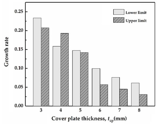 Compared to the cover plate with the free-mode, both the upper and lower limits for the cover plate with the fixed-mode are higher regardless of the thickness, while the size of the transition velocity region is only larger when the cover plate is 3 mm, 4 mm, and 5 mm in thickness. In addition, it can be seen that the growth rate of the transition velocity region is the largest for the fixed cover plate with the thickness of 4 mm (equal to that of the tube). Then, the increase rate of the transition velocity region for the cover plate with the free-mode is higher than that with the fixed-mode, which decreases slightly. Therefore, the size of the transition velocity region does not enlarge linearly with the increase in cover plate thickness due to the slow growth of the upper limit. Accordingly, thickness thresholds exist, which are 5 mm and 6 mm for the fixed and free cover plates, respectively.