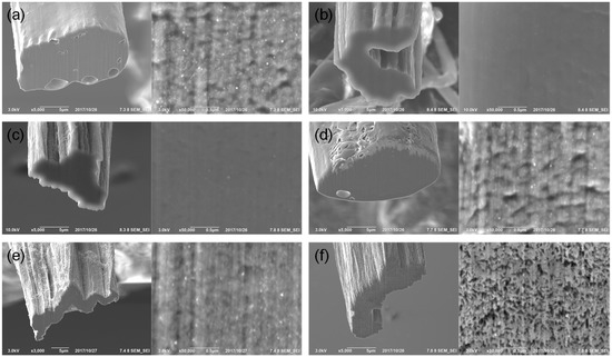 Cross-section images of CNTFs with infiltrated (a) Resin #1, (b) Resin #2, (c) Resin #3, (d) Resin #4, (e) Resin #5, and (f) Resin #6. The left images are low-magnification images and the right images are high-magnification images.
