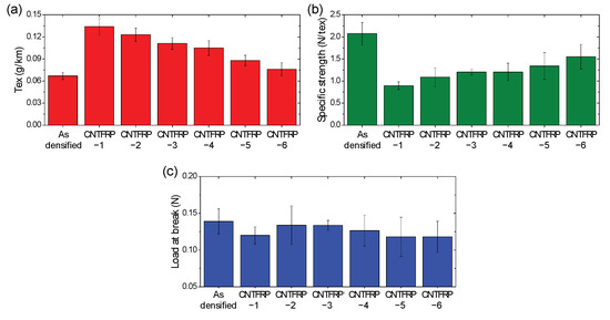 (a) Linear density, (b) specific strength, and (c) load-at-break value of the as-densified CNTF and composite fibers.