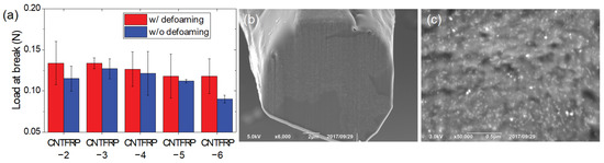 In this study, all the composite fibers that are discussed above were prepared with the defoaming process. We also prepared the composite fibers without the defoaming process to observe the effect of the defoaming process. Figure 5 shows the load-at-break value of the composites fiber with and without the defoaming process. Regardless of the type of resin, the load-at-break values were reduced. The reason for this observation can be found in the cross-section image (see Figure 5b,c). Figure 5b,c show the internal structure of CNTFRP-2 prepared without the defoaming process. Contrary to CNTFRP-2 prepared with the defoaming process (see Figure 2b), the internal nanopores were observed when the defoaming process was not applied. Since the internal pores reduce the load-at-break value of the composite fibers, the defoaming process is necessary during the fabrication of the CNTFRP.