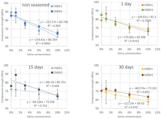 It was noted that the compressive strength of the samples containing 6 and 10%, respectively, of the impurities before seasoning did not meet the values set out in the above standard. For uncontaminated samples (0%), the strength dropped below the value specified in the standard only after 30 days of seasoning in saline solution.