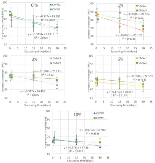 The obtained values of compressive strength should be analysed according to the values of two variable test parameters for each cement: degree of contamination and seasoning time, and the nature of their variability. The results obtained, summarised twice in different grouping configurations, are presented in Figure 1 and Figure 2. In the first case, the results of experimental tests were grouped according to the seasoning time and the change of the examined feature was presented along with an increase in the degree of cement contamination. In the second case, the results of samples with the same method of preparation (degree of contamination) were grouped and the effect of seasoning time on compressive strength was analysed.