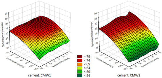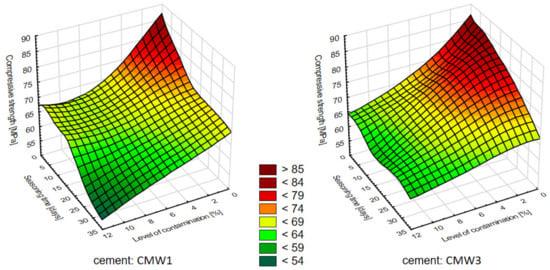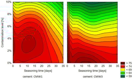 Knowing the results of the influence of the analysed variable parameters of the degree of contamination and seasoning time on the compressive strength of the cement samples, an attempt was made to compile a summary of this influence in the form of the plane—of a 3D diagram. Figure 3 presents the planes generated for the average strength values of both cements. Figure 4 shows contour diagrams, which are projections of 3D diagrams from above while combining points of equal strength and generating homogeneous areas from them.