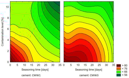 Based on the above results of the influence of the analysed variable parameters of pollution degree and seasoning time, 3D surface diagrams were prepared, corresponding to those for compressive strength (Figure 7), followed by contour diagrams (Figure 8)—homogeneous areas in the 3D chart, view from above.