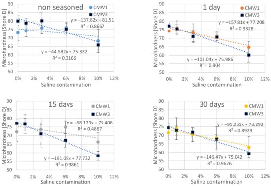 The results of the measurements of microhardness of the surface of the tested cements carried out over a period of 30 days are presented in a similar way as the above described results of compressive strength in Table 5. Figure 5, in turn, presents a summary in which the results or subsequent test days are grouped together and the change in hardness is shown depending on the degree of contamination changes. Results for the opposite configuration are summarised in Figure 6.