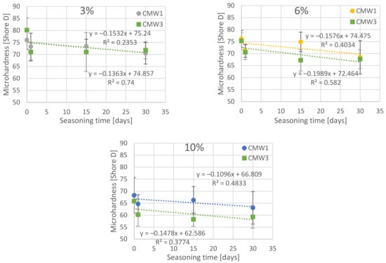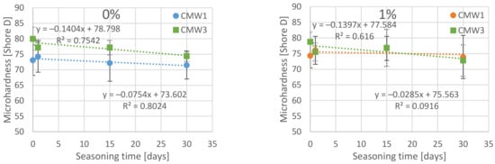 Summary of results of the statistical analysis of microhardness test results depending on seasoning time, grouped by degree of admixture.