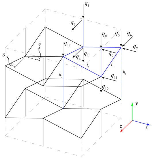 Considered degrees of freedom for analytical solution of the structure. The unit cell has four vertical (xy, yz, and two bisectors of xy and yz) and one horizontal (xz) symmetry planes. , , and l are dimensional parameters of the unit cell.