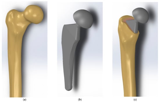 In this study, the upper half of human femur bone with a total length of 25.83 cm has been considered for numerical modelling and analysis (Figure 3a). The femur bone geometry was obtained from computed topography (CT) scans of a 40-year-old healthy male. Using MATLAB (MathWorks, Natick, MA, USA), a 3D model consisting of external surfaces of the femur bone geometry was constructed. The obtained surfaces were then transferred to SolidWorks (Dassault Systèmes, Vélizy-Villacoublay, France), and the final model was polished there to provide a smooth and easy-to-use femur bone computer-aided design (CAD) model.