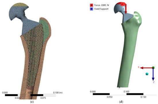 The FE analyses of the implants under static compressive loading condition were performed using the ANSYS Workbench (ANSYS, Canonsburg, PA, USA) software (Version 19.3). To better simulate the real human femur loading condition, the femur bones were angled at 12° flexion and 12° adduction, and the lower part of the femur bone (middle shaft) was fixed in all the directions. The femoral head was loaded by applying a 2000 N compressive load to the head of the femur implant. The loading and boundary conditions considered in this study are based on the basic experimental setups which have been used in several experimental studies of human femur hip implants [58,62,63].
