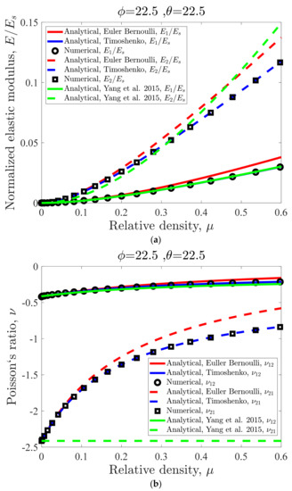 As for the Poisson’s ratio, the results show that even though is always negative, relative density has very little effect on its value (Figure 5b). In fact, only changes in the range of −0.2143 and −0.4132. However, changing relative density from 0.6 to almost zero changes from −0.8393 to −2.414. Timoshenko beam theory usually predicts greater negative Poisson’s ratio (in an absolute sense) when compared to the Euler-Bernoulli beam theory. Regardless of direction, the curves obtained by Yang et al. [38] do not have any overlap with neither the analytical Timoshenko results nor with the analytical Euler-Bernoulli results. A more prominent difference between our results and those of Yang et al. [38] is for . While Yang et al. [38]’s theory gives the constant value of −2.414 for in all the relative densities, the analytical results in the current work show that changes from −0.8393 to −2.414 (Figure 5b). Similar to elastic modulus results, the FE results always overlap with the analytical results based on Timoshenko beam theory.