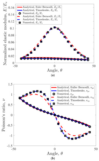 Considering the behaviour of the re-entrant unit cell as the sum of the behaviour of individual DOFs for an analytical solution, which works as one of the most accurate approaches used for obtaining the analytical relationships for strut-based lattice structures and metamaterials. This technique, by considering all possible deformations of the struts at the joints in the lattice structure, provides comprehensive and accurate analytical solutions for the mechanical properties of lattice structures. The results of this study also confirmed that the obtained relationships for normalized elastic modulus and Poisson’s ratio of re-entrant structure based on this technique present satisfactory outcomes in comparison to other approaches presented in the literature [65]. Moreover, the general analytical solution based on this approach gives this opportunity to implement and compare the results of both the Euler-Bernoulli and Timoshenko beam theories simply by changing the corresponding parameters ( and ). As shown in Figure 5, the Timoshenko beam theory gives much more accurate results in comparison with the Euler-Bernoulli beam theory due to the fact that it takes the shear deformation effect in the struts into account. Therefore, the Timoshenko beam theory allows for more flexibility in the structure. Hence, as compared to Euler-Bernoulli beam theory, Timoshenko beam theory predicts lower and higher values for the elastic modulus and Poisson’s ratio, respectively. Based on the aforementioned facts, we observed significant improvement in the final analytical solution in comparison with previous works [35,38], especially for normalized elastic modulus in the x-direction and . According to the final relationships, is dependent on the relative density and angles and . However, the relationship presented by Yang et al. [38] is independent of relative density or strut thickness which is far from accurate especially for high values of relative density.