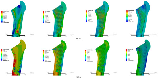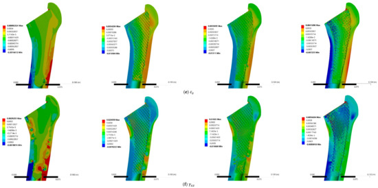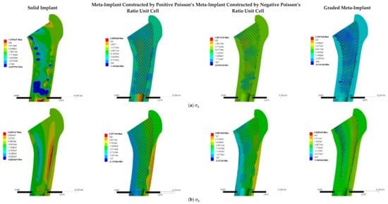 The stress and strain distributions in femur bone filled by the solid implant, the meta-implant constructed by positive Poisson’s ratio unit cells, the meta-implant constructed by negative Poisson’s ratio unit cells, and the meta-implant with the graded distribution of unit cells are shown in Figure 7. In the case of the solid implant, there is a high mismatch of , , and between the solid implant and the surrounding bone. In the case of the meta-implant constructed by positive unit cells, the mismatch of the noted stress (, , and ) between the implant and the bone is mitigated. Unlike the solid implant, the local stress distribution in meta-implant does not change uniformly. In fact, different regions of each unit cell have different stresses. Some parts of each unit cell experience stress levels similar to that of the bone, while some other parts of it experience different stress levels. From a mechanical point of view, this was well expected as some struts mainly undergo flexural loading, while some other struts mainly undergo axial loading.
