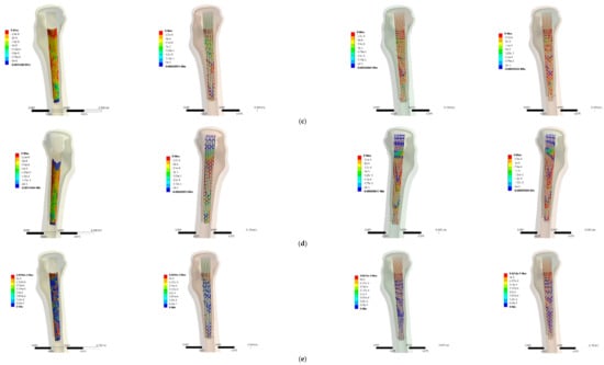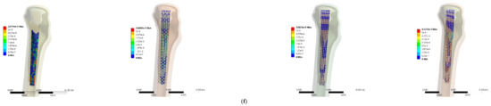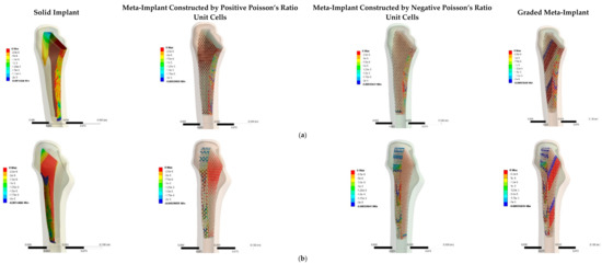 In addition to stress and strain distributions, the level of stress dominant in the implant is also important. Very high-stress levels can lead to early implant failure. As for the case of the solid implant, the maximum stress in the implant is MPa (Figure 7a) which is relatively low, as was expected. In the case of meta-implant constructed by positive unit cells, the maximum stress level is MPa. In the case of the meta-implant constructed by negative unit cells, the maximum stress level is MPa. In the case of the graded meta-implant, the maximum stress level is MPa. This shows that the graded meta-implant experiences much lower stress levels as compared to the two other meta-implants, and that the stress the graded meta-implant experiences is in the range bearable by titanium alloys.