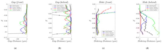 Micromotions in implant faces: (a) front-side gap, (b) back-side gap, (c) front-side sliding, and (d) back-side sliding.