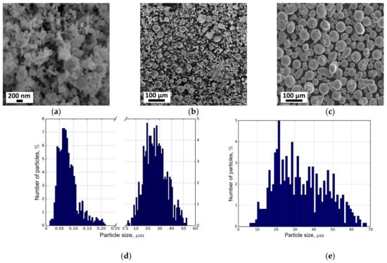 Stainless steel 316L was used as a feedstock material. The Höganäs powder with a unimodal PSD of 20–53 µm (see Figure 1e) is compared with the originally produced powder with a bimodal PSD of 20–150 nm and 5–50 µm (see Figure 1d). The nanoscale fraction was produced using the electric explosion of wire (EEW) method without technological passivation [26]. The mass ratio of nanoparticles to microparticles was approximately 1:4. It should be noted that the microscale part of the bimodal PSD is more symmetric than the nanoscale one, which has a slowly decaying tail in the range of 100–200 nm. The chemical content of the powders is provided below in Section 3.2.