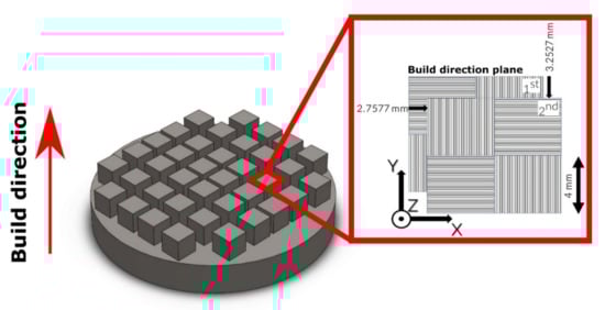 where ρmat is the 316L steel powder density at room temperature (7957 kg m−3 [28]), is the weight of the cubic sample in the air (kg). Vcub is the volume that was defined using the Ohaus density determination kit (OHAUS Corporation, Parsippany, NJ, USA) and was calculated as: