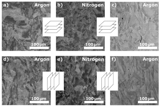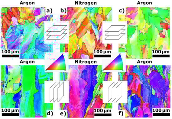 The SEM analysis results are shown in Figure 3 for the samples with the following printing parameters: the laser power was 120 W, and the scanning speed was 300 mm s−1 (the resulting specific laser energy was E = 250 J mm−3). The results of the EBSD analysis and estimated average grain sizes are shown in Figure 4. In the top-down view (Figure 4a–c), the dominant crystallographic texture comprised columnar grains for both PSDs and protective atmospheres. It should be noted that predominant crystallographic direction is observed only for the top-down texture of fabricated samples from the bimodal PSD in a nitrogen atmosphere (Figure 4b) [29]. In addition, other directions, such as and were identified for argon atmosphere, respectively in Figure 4a,c [2,30]. Different textures were recognized in the front view (Figure 4d–f). The prevailing crystallographic directions and are observed.
