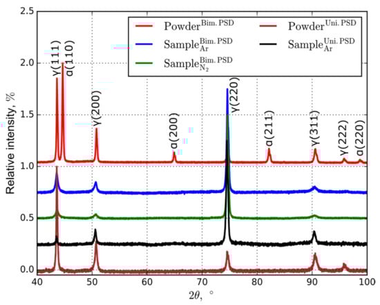 The X-ray diffraction (XRD) analysis is shown in Figure 5. Depending on solidification and heat treatment conditions, the 316L steel can form two phases: the α-phase (ferritic matrix with body-centered cubic (BCC) lattice) and the γ-phase (austenitic matrix with FCC crystalline structure) [31]. The high-temperature α-phase is also known as δ-phase (delta ferrite). The bimodal powder consists of both phases (Figure 5 red line). This fact is attributed to extremely high cooling rates that occur in the production of powder by the EEW method [26]. The unimodal powder and all the samples contain the γ-phase only (Figure 5 brown and black lines). For samples fabricated from the bimodal powder, the α-phase is absent after the printing process in both atmospheres (Figure 5 blue and green lines). Therefore, the final material is fully austenitic due to quite high cooling rates in laser powder bed fusion. Under such solidification conditions, the austenite–ferrite transition in 316L steel is strongly suppressed [32]. Furthermore, for the printed samples processed in nitrogen, the doping with a small amount of nitrogen stabilizes the formation of the austenite phase [5,17,33]. For the bimodal powder, the relative intensities of the diffraction peaks for the samples 3D-printed in nitrogen are lower than those processed in argon, which can be explained by different crystallographic textures [34].