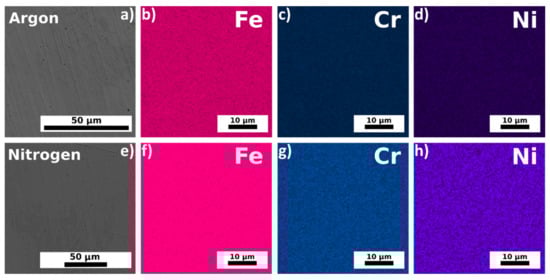 The energy-dispersive X-ray (EDX) results for the samples fabricated from the bimodal powder under argon (Figure 6a) and nitrogen (Figure 6e) protective atmospheres are shown in Figure 6b–d and Figure 6f–h, respectively. The printing was conducted with a laser power of 150 W and a scanning speed of 600 mm s−1 (the resulting specific laser energy was E = 156 J mm−3).