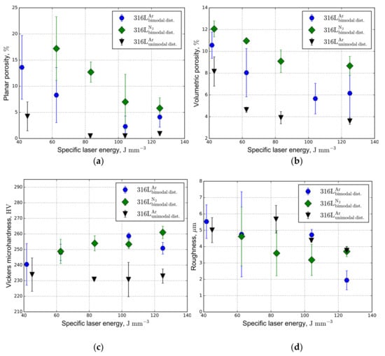 The porosity, microindentation, and surface roughness results for various PSDs and protective atmospheres are shown in Figure 7. The best values of density, Vickers microhardness, and surface roughness at different specific laser energy are shown in Table 3. It was found that the porosity of the 316L steel samples printed from the bimodal powder was higher for the same laser-related settings than that for the samples printed from the unimodal powder (Figure 7a,b) regardless of the protective atmosphere. The porosity decreases with increasing specific laser energy, which is consistent with [35,36,37]. The high porosity at low specific laser energy can be explained by insufficient wettability and lack of complete melting of powder particles. Starting from specific laser energy of 120 J mm−3, the planar and volumetric porosity of the samples 3D-printed from both powder feedstock gradually increases (Figure 7a,b). For the bimodal powder, the planar porosity of the sample 3D-printed in nitrogen is ~15% higher than for argon atmosphere (Figure 8).