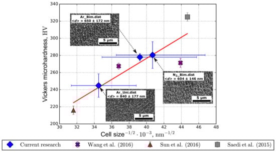 Vickers microhardness as the function of average cell size for different powder PSDs and protective atmospheres [8,41,42].