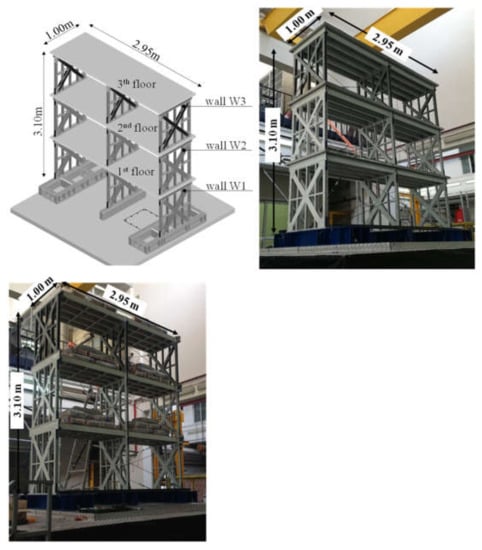 The two tested mock-ups were reduced scale three-story and two bay CFS buildings (Figure 1) with a rectangular plan of 0.95 m × 2.95 m and a total height of about 3.10 m. The mock-ups were representative of two residential buildings designed and selected as case studies and they were scaled considering a scaling factor equal to 1:3. To scale the mock-ups, three independent scaling factors were fixed, length (SL = 1/3), stress (Sσ = 1) and acceleration (SA = 1), while scaling factors of other parameters (dependent parameters) are defined according to the similitude laws [40]. More details about case study design and scaling procedure are available in Fiorino et al. [41].