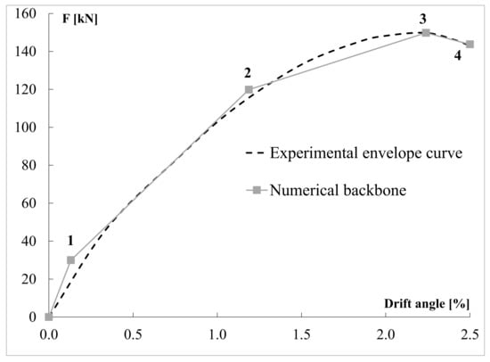 The first point (1) of the backbone envelope curves was located at 50% of the experimental yielding strength; the second point (2) corresponded to the elastic limit observed in experiments; the third point (3) represented the experimental peak strength; the fourth point (4) of numerical backbone curve corresponded to the maximum experimental displacement and the corresponding force, selected with an energy balance. In this way, the area under the numerical backbone curve between points (3) and (4) was equal to the corresponding area of the experimental envelope curve. The comparison between experimental and numerical envelope curves for the wall located at third floor is shown in Figure 2.