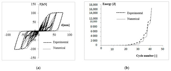To define Pinching4 material many parameters need to control cyclic behavior. The parameter rDisp, governing ratio between the displacement of the reloading point and maximum positive displacement of preceding cycles, was set equal to 0.01, 0.05 and 0.1 for walls at first, second and third story, respectively. The parameter rForce was set equal to 0.01 for all the walls. Rest of the parameters required were set equal to 0. Wall models were validated by comparing the experimental [39] and numerical responses in term of force-displacement response (Figure 3a) and cumulative energy (Figure 3b). Since cyclic tests were carried out for all the wall configurations, each wall model was compared with the corresponding test. The comparison is shown in Figure 2 for the wall at third story.