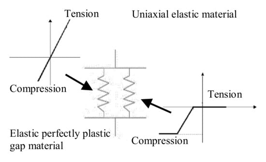 Since the hold-down offers different stiffness in tension and compression, the approach suggested by Leng et al. [44] was employed; indeed, hold-downs were modelled with two parallel Zerolength elements (Figure 4), in which the first element used uniaxial elastic material representing the stiffness of hold-down connection only, while the second element used elastic-perfectly plastic gap material with a zero-gap, representing the stiffness in compression offered by foundation or floor. Uniaxial elastic material in case of the Type 1 mock-up had a stiffness of 20, 10, and 7.5 kN/mm for the walls at first, second and third story, respectively, whereas in case of Type 2 mock-up it had a stiffness of 20, 20, and 15 kN/mm for the walls at first, second and third story, respectively. Elastic-perfectly plastic gap material had stiffness of 20 kN/mm for foundation, whereas for floors a very low value was used. The yield strength used for Elastic-perfectly plastic gap material was also calibrated experimentally [39].