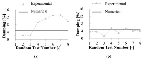 Experimental damping range for (a) Type 1 and (b) Type 2 mock-ups and Rayleigh damping value selected for the model.