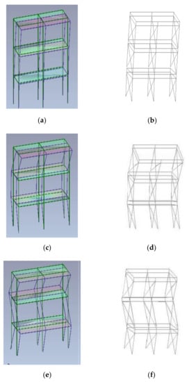 Comparison of experimental (Artemis) and numerical (OpenSees) modal shapes [42]. (a) First experimental modal shape; (b) First numerical modal shape; (c) Second experimental modal shape; (d) Second numerical modal shape; (e) Third experimental modal shape; (f) Third numerical modal shape.