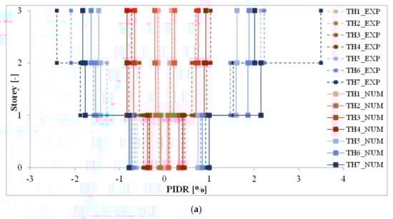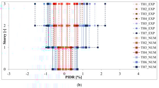 Moreover, a comparison between experimental and numerical results in terms of PRDR is shown in Figure 9. The experimental to numerical ratio is in the range 0.99 to 1.27 for Type 1 mock-up and 0.92 to 1.41 for Type 2 mock-up. It can be noticed that globally models are able to capture experimental behavior in term of roof drift ratio (RDR), but the PRDRs are not captured very accurately. The inaccuracy of the prediction could be attributed to the fact that models well predict the first mode, but with less accuracy the others.