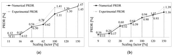 Comparison between experimental and numerical peak roof drift ratio (PRDR). (a) Type 1 mock-up; (b) Type 2 mock-up.