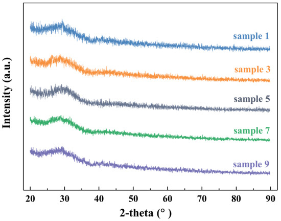 The slags were prepared with the analytical reagents CaO, SiO2, MgO, Al2O3, and TiO2 based on the design of slag. All the reagents were heated in an electric resistance furnace at 1273 K for 150 min to remove impurities. The mixture was precisely weighed at 180 g and packed into a Mo crucible. The samples were heated to 1873 K in a muffle furnace with high-purity argon gas (99.99%, 0.5 L/min). After 120 min heat preservation, the slag was rapidly quenched in distilled water, and the cooled slag sample was taken out and dried. All quenched slags were colorless and transparent, which suggested the main valence state of Ti ions is Ti4+. The quenched slag was ground and then analyzed by X-ray diffraction (XRD, MAXima-7000, Shimadzu, Kyoto, Japan) that used Cu Kα radiation (λ = 1.5406 Å) with the scan rate of 6°/min in the 2 degree range of 10° to 90°. Figure 1 shows the XRD pattern of the representative slag samples. It could be seen that there were no characteristic peaks, which proved that the quenched slag was amorphous. FTIR spectroscopy (Nicolet 6700; Thermo Fisher Scientific, Waltham, MA, USA) was used to analyze the slag structure. During the measurement, 3.0 mg quenched slag powders and 350 mg KBr were mixed and pressed into a film. The scanning time was set as 32 s. The wavenumber range of 400–4000 cm−1 was recorded with a resolution of 4 cm−1.